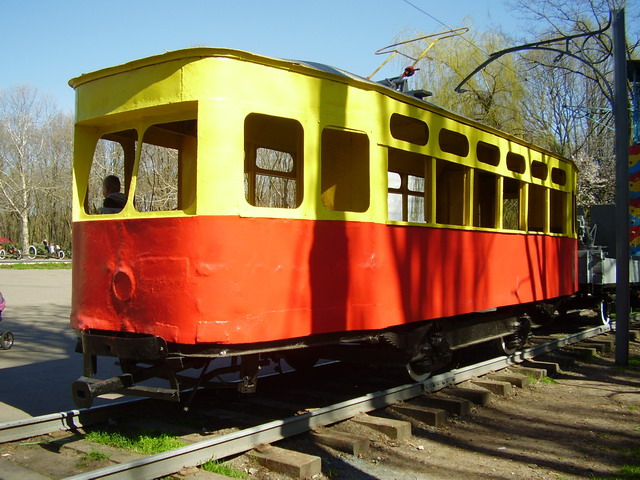 Уже без окон, только металлический корпус, но видно недавно выкрашенный, отдан на радость детям, коих в парке наблюдалось большое количество. Благо погода была солнечной.