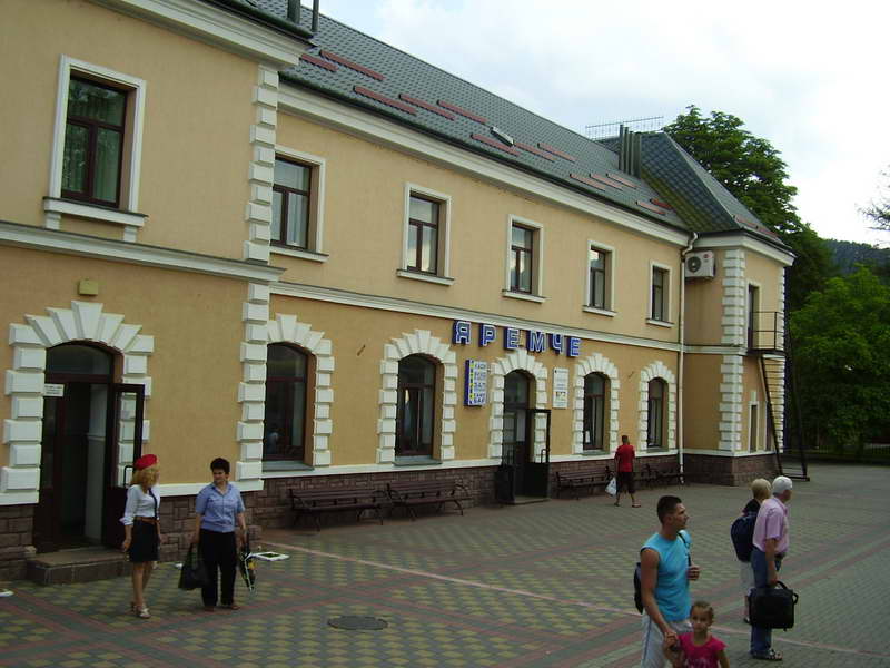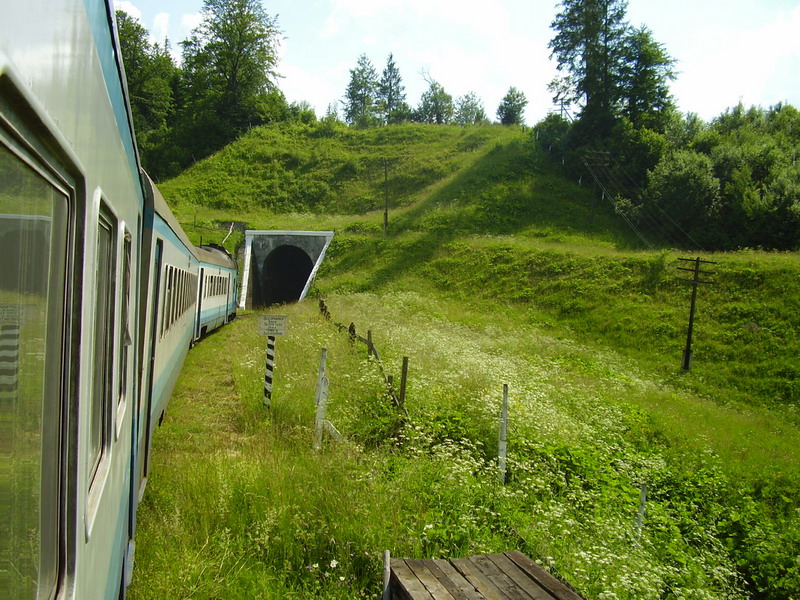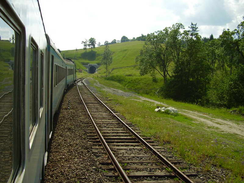 Немного разогнавшись поезд заскочил в последний тоннель и выскочив из него сразу на мост стал приближаться к станции Яремче - первому крупному туристическому центру в Карпаты по этому пути.