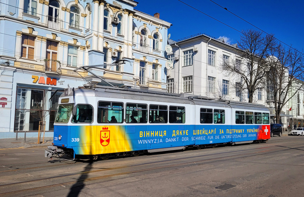 Швейцарія з перших днів війни підтримувала Україну, у зв’язку з цим вінницька громада вирішила подякувати швейцарцям зобразивши на вагоні Be 4/6 тематичний дизайн, який містить пропори Швейцарії та України. Вздовж всього вагону на борту був надпис українською мовою «Вінниця дякує Швейцарії за підтримку України» та німецькою «Winnyzja dankt der Schweiz für die Unterstützung der Ukraine». 14 липня 2022 року цей вагон постраждав від ракетного обстрілу на площі Перемоги у центральній частині Вінниці. Після декількох місяців вдалося повністю відремонтувати цей трамвай; він став своєрідним символом незламності для вінничан!