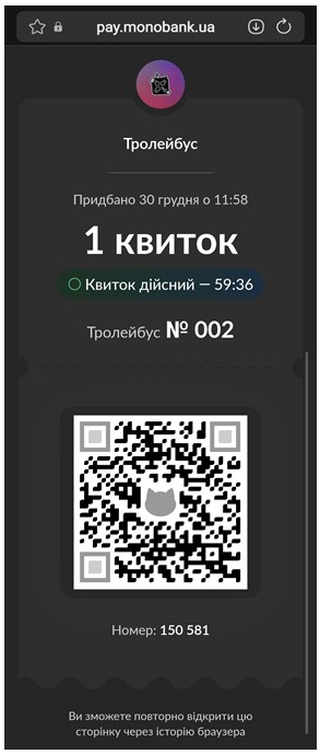 Після здійснення оплати квиток відкриється у браузері смартфона. Аналогічно до оплати через застосунок, на квитку зазначений час придбання, термін дії, номер транспортного засобу та QR-код для перевірки дійсності квитка. Якщо закрити сторінку з квитком, її можна відновити через історію браузера — квиток буде знову показаний на екрані.