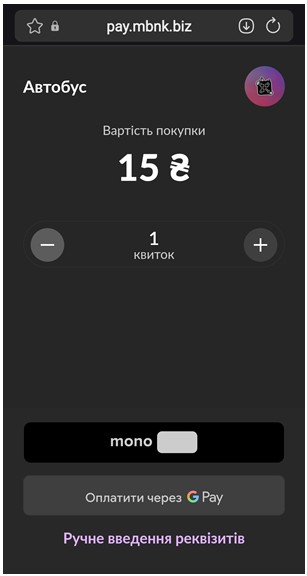 - обрати кількість квитків та спосіб оплати: застосунок monobank, Google Pay, Apple Pay або введення даних картки вручну;